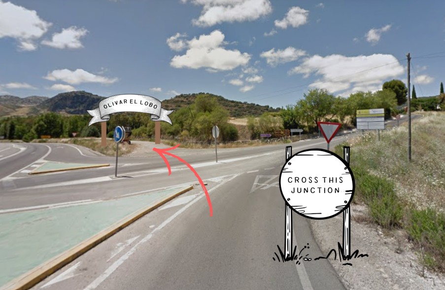 - Do not go up the hill, drive straight across the junction onto the dirt track road, then over a speed bump and Olivar el Lobo is on your right at the "Stop" sign. See the picture below.